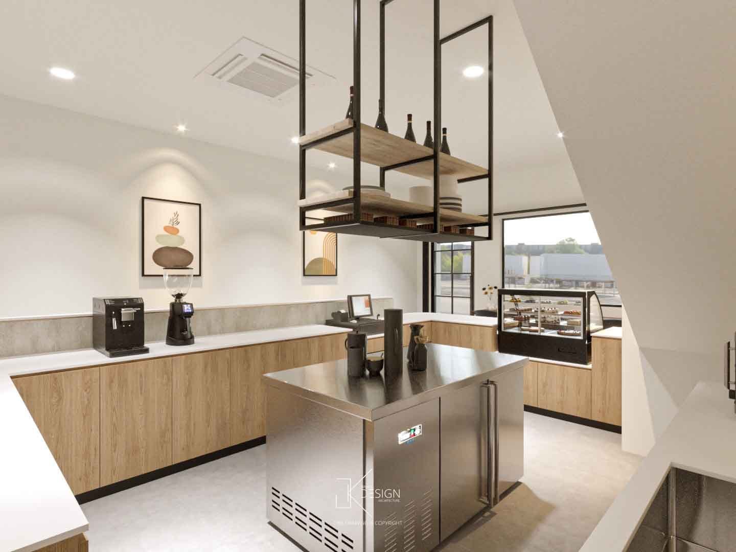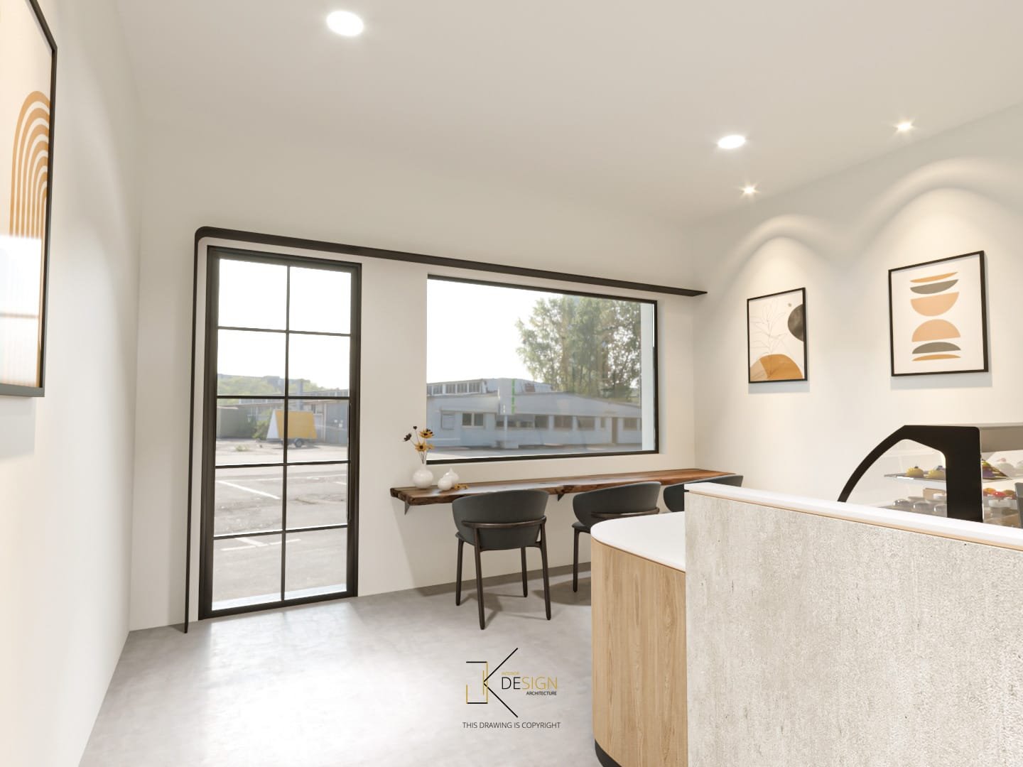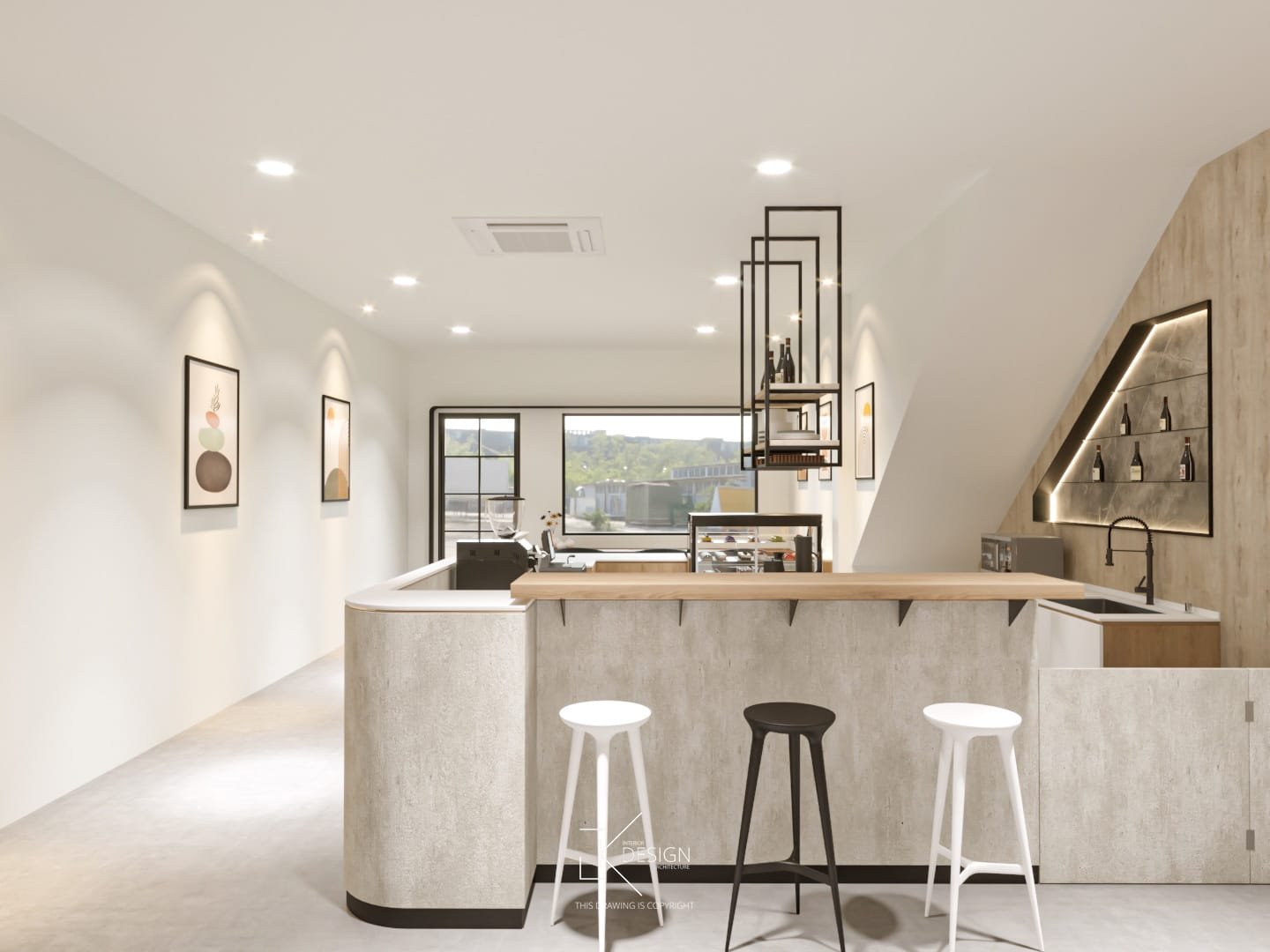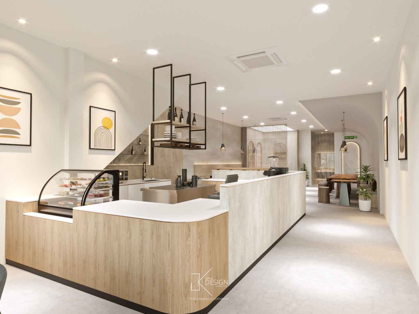 A Japandi-inspired café that integrates subtle modern nuances, defined by a neutral palette and organically curved architectural elements. Textured walls accentuate key focal areas, enhancing visual interest and customer engagement. The warmth of light wood contrasts with darker elements, grounding the space in a refined yet inviting ambiance. This meticulously curated interior fosters a serene, welcoming environment, designed to inspire relaxation and encourage guests to linger.