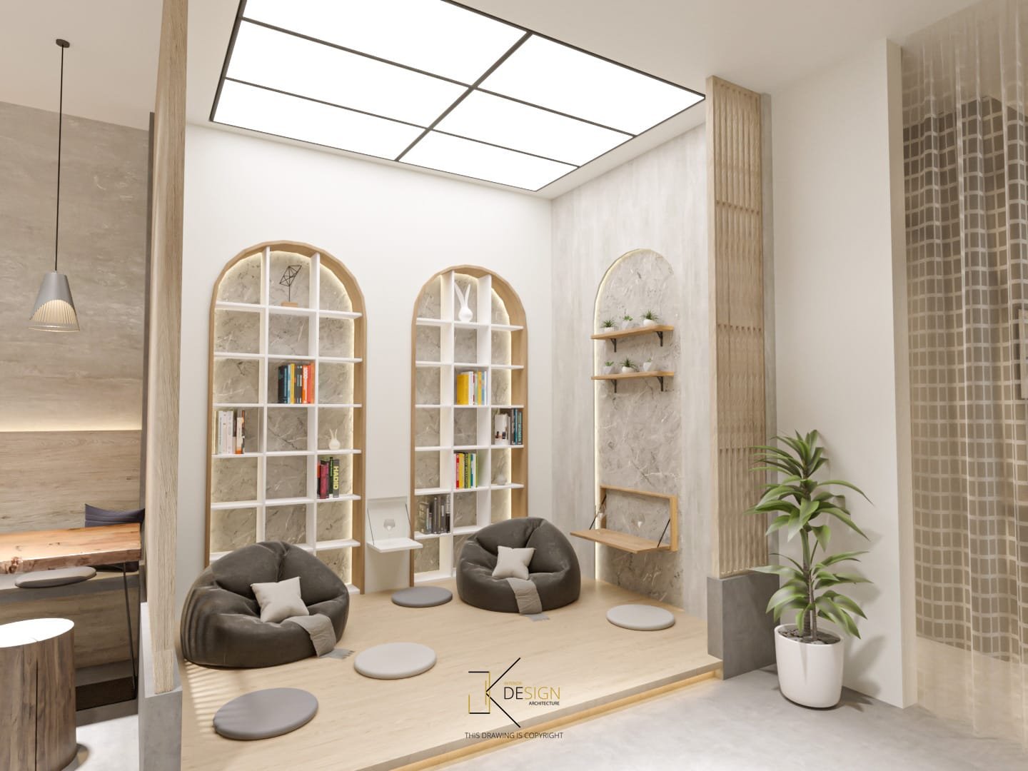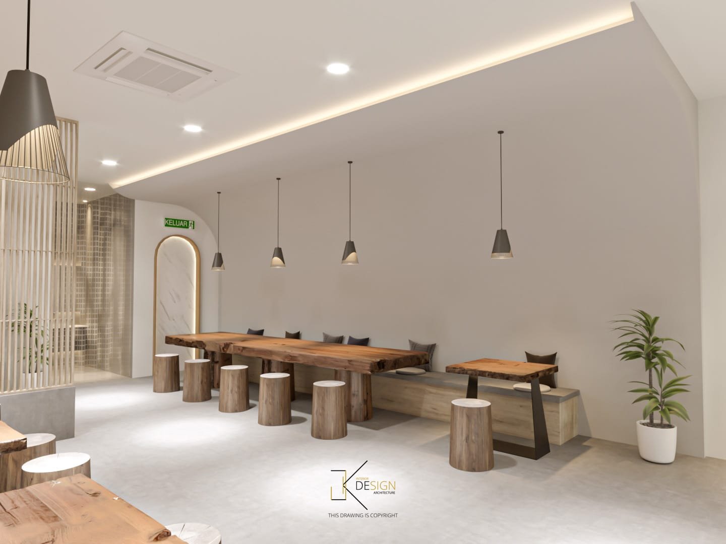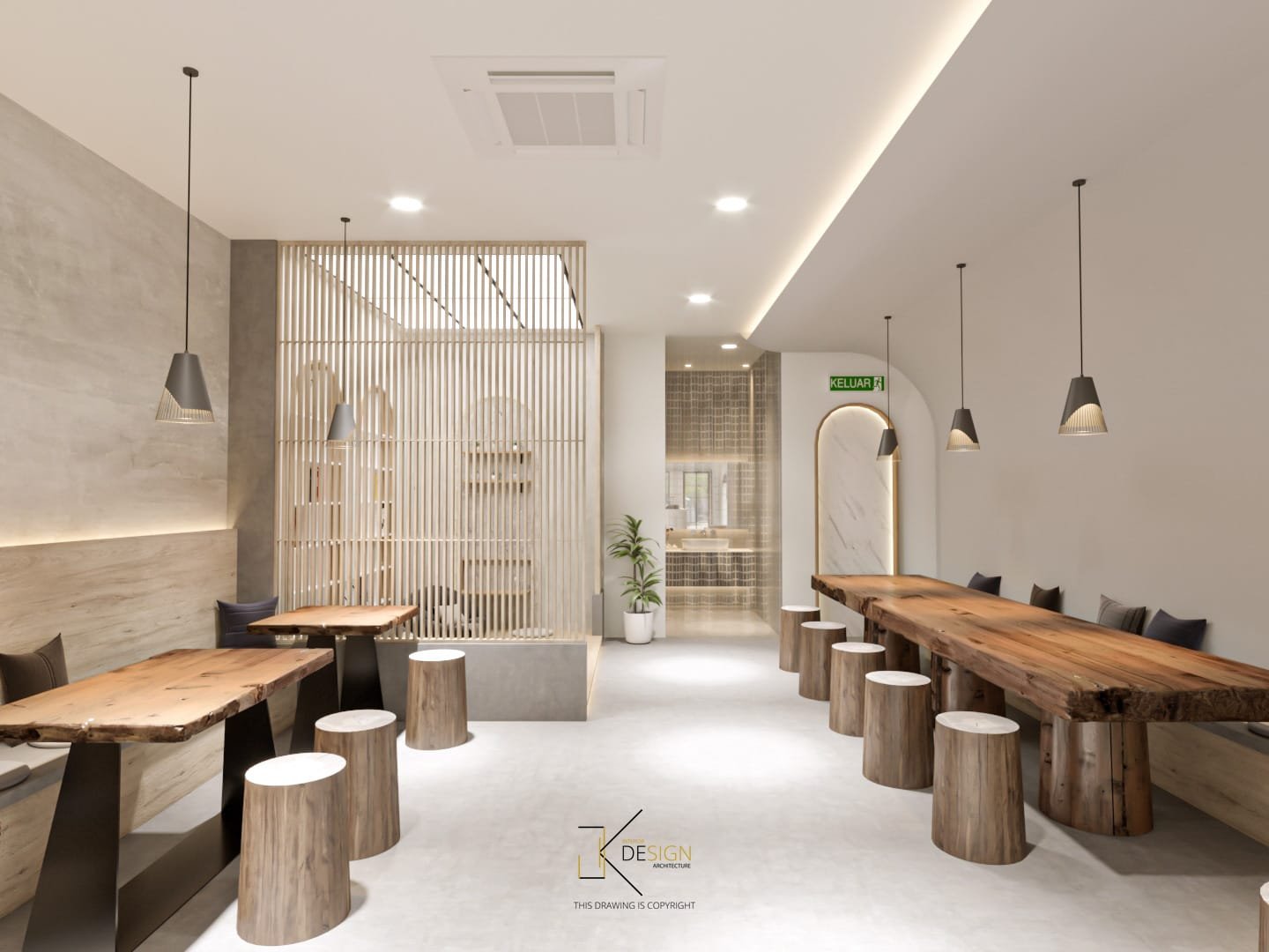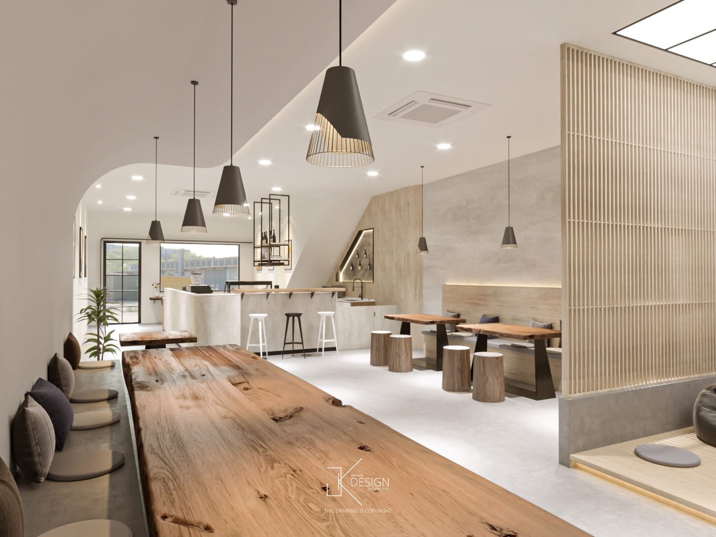A Japandi-inspired café that integrates subtle modern nuances, defined by a neutral palette and organically curved architectural elements.