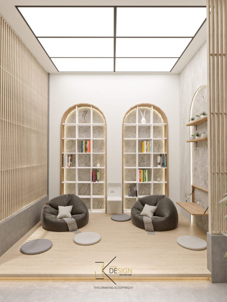 A Japandi-inspired café that integrates subtle modern nuances, defined by a neutral palette and organically curved architectural elements.